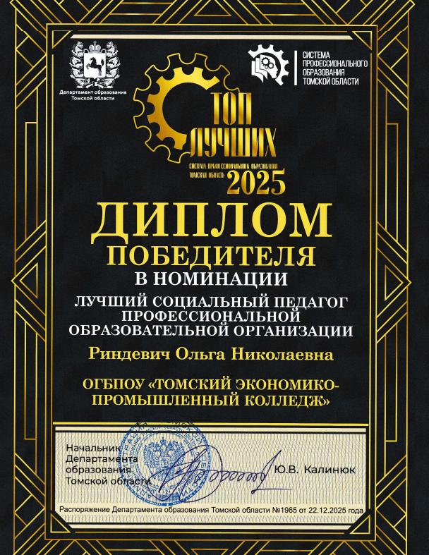 С огромной радостью мы делимся блестящей новостью: Ольга Николаевна Риндевич, социальный педагог нашего колледжа, стала победителем в престижной номинации «Лучший социальный педагог профессиональной образовательной организации» в рамках VIII регионального конкурса «Топ-85 событий системы профессионального образования Томской области»!⠀