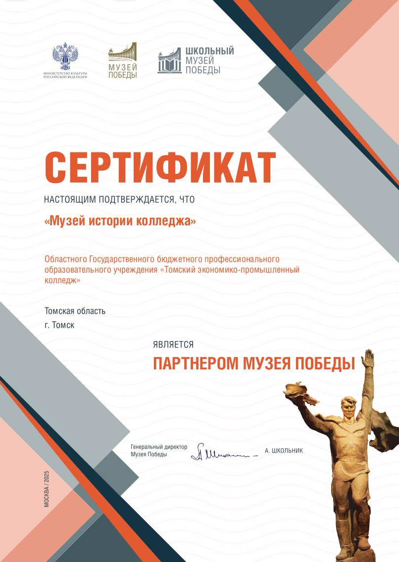 Томский экономико-промышленный колледж получил высокое признание на федеральном уровне. По итогам заседания Экспертной комиссии Музея Победы (г. Москва) Музей истории ТЭПК был включен в долгосрочную программу «Школьный Музей Победы» и получил официальный статус Партнера Музея Победы.